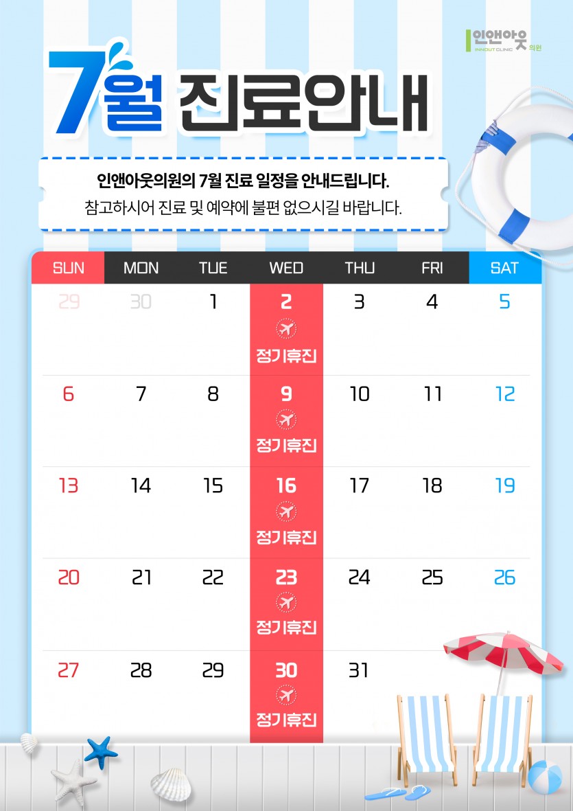 인앤아웃의원 7월 진료안내 페이지 정보 작성자 최고관리자 댓글 0건 조회 233회 작성일 25-06-27 08:56 목록 본문 인앤아웃읜 7월 한달간 수요일 정기휴진입니다. 이전글인앤아웃의원 8월 진료안내 25.07.31 다음글인앤아웃의원 6월 진료 안내 25.05.26 댓글 0 댓글목록 등록된 댓글이 없습니다.
