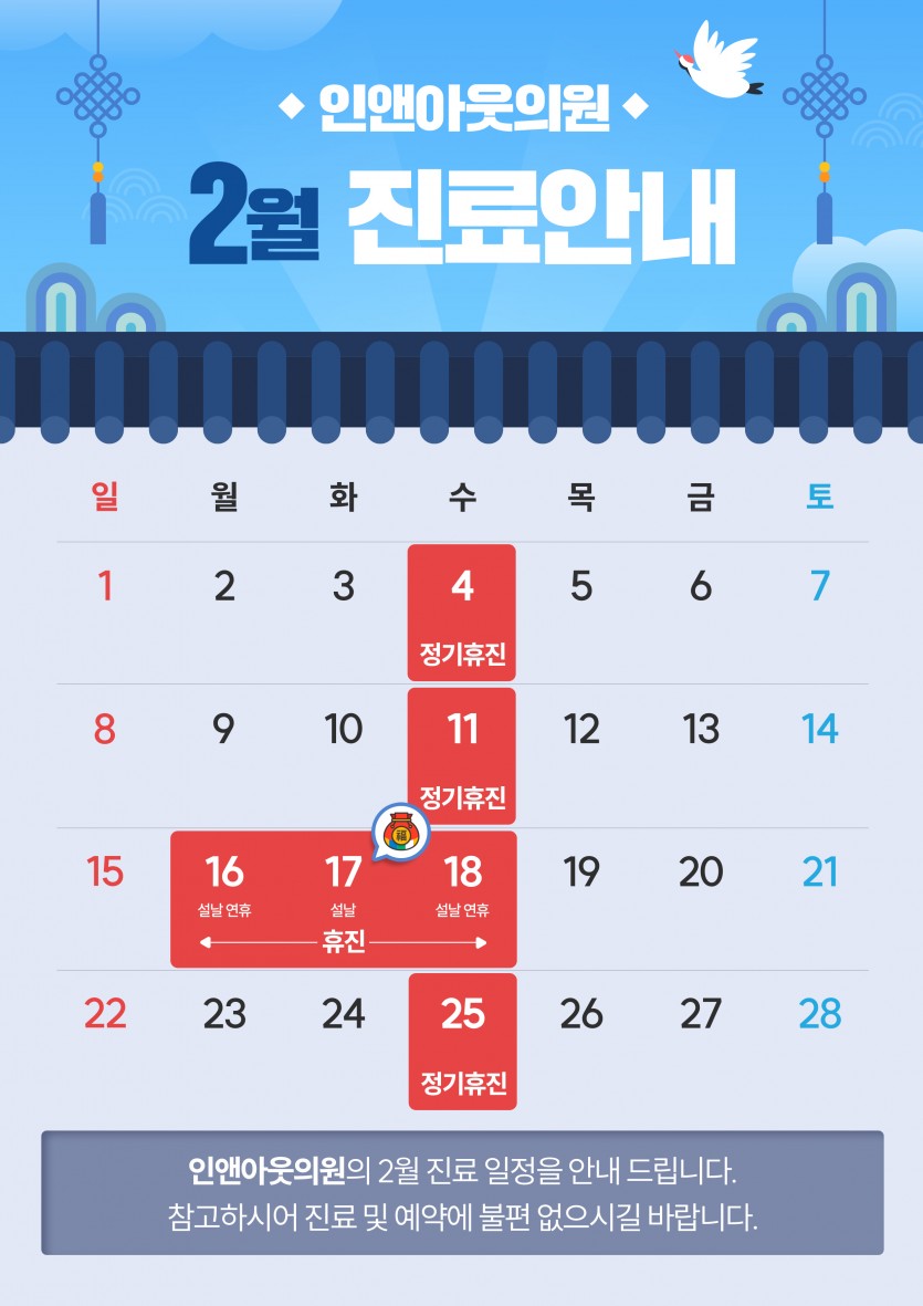 인앤아웃의원 2월 진료안내 페이지 정보 작성자 최고관리자 댓글 0건 조회 16회 작성일 26-01-29 13:37 목록 본문 인앤아웃의 2월 진료 일정을 안내드립니다. 참고하시어 내원 및 예약에 불편 없으시길 바랍니다. 다음글인앤아웃의원 2026년 1월 진료안내 25.12.26 댓글 0 댓글목록 등록된 댓글이 없습니다.